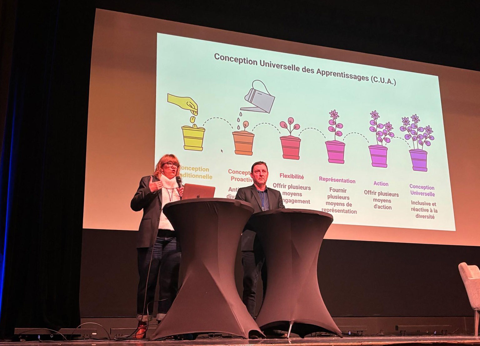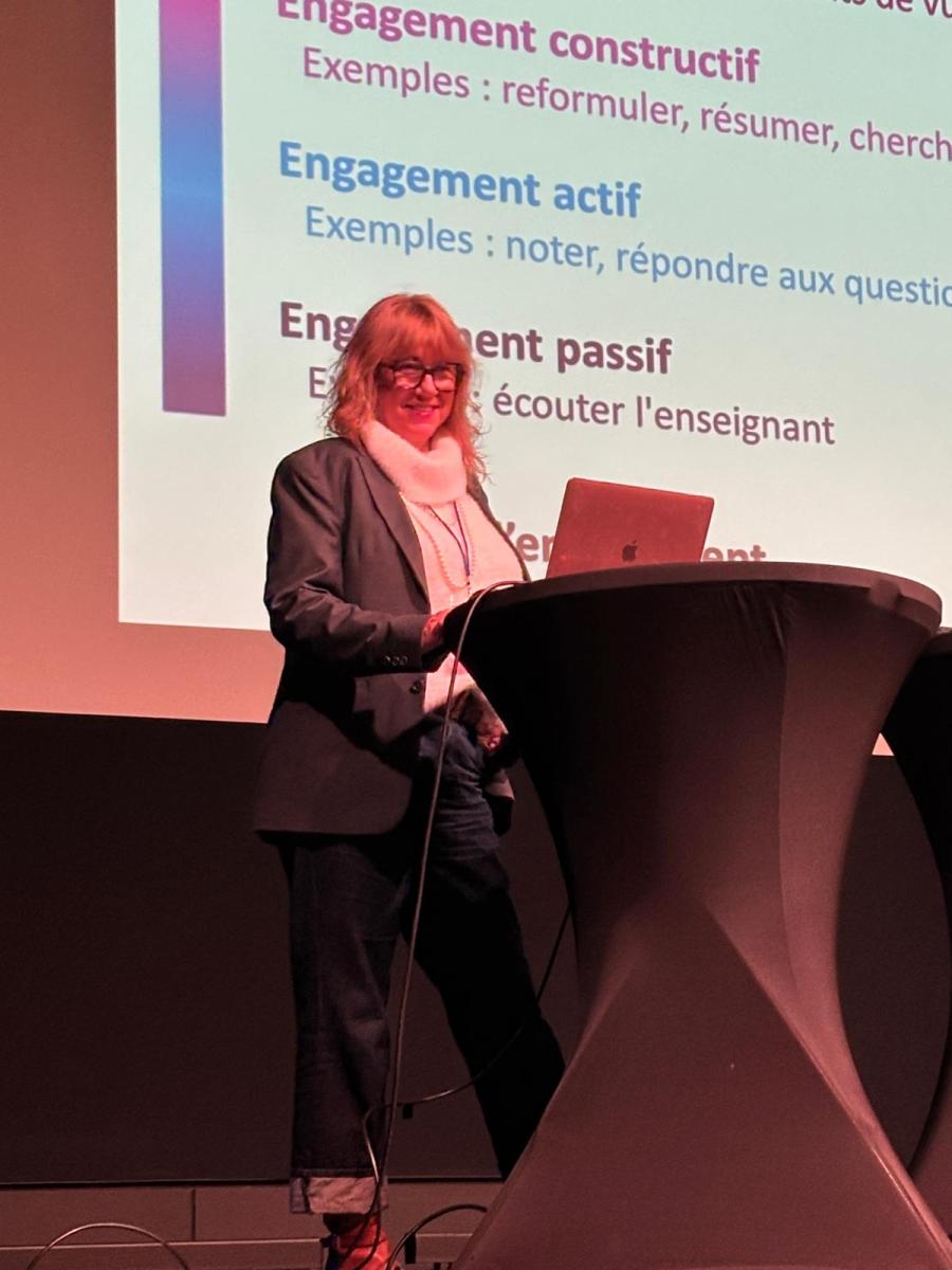 Sylvie Wrzecionek Benichou a quant à elle décrypté la CUA (Conception Universelle des Apprentissages) et analysé les bénéfices de l’inclusion pour les élèves ciblés, pour l’ensemble de la classe ainsi que l’effet sur les compétences psychosociales de tous.