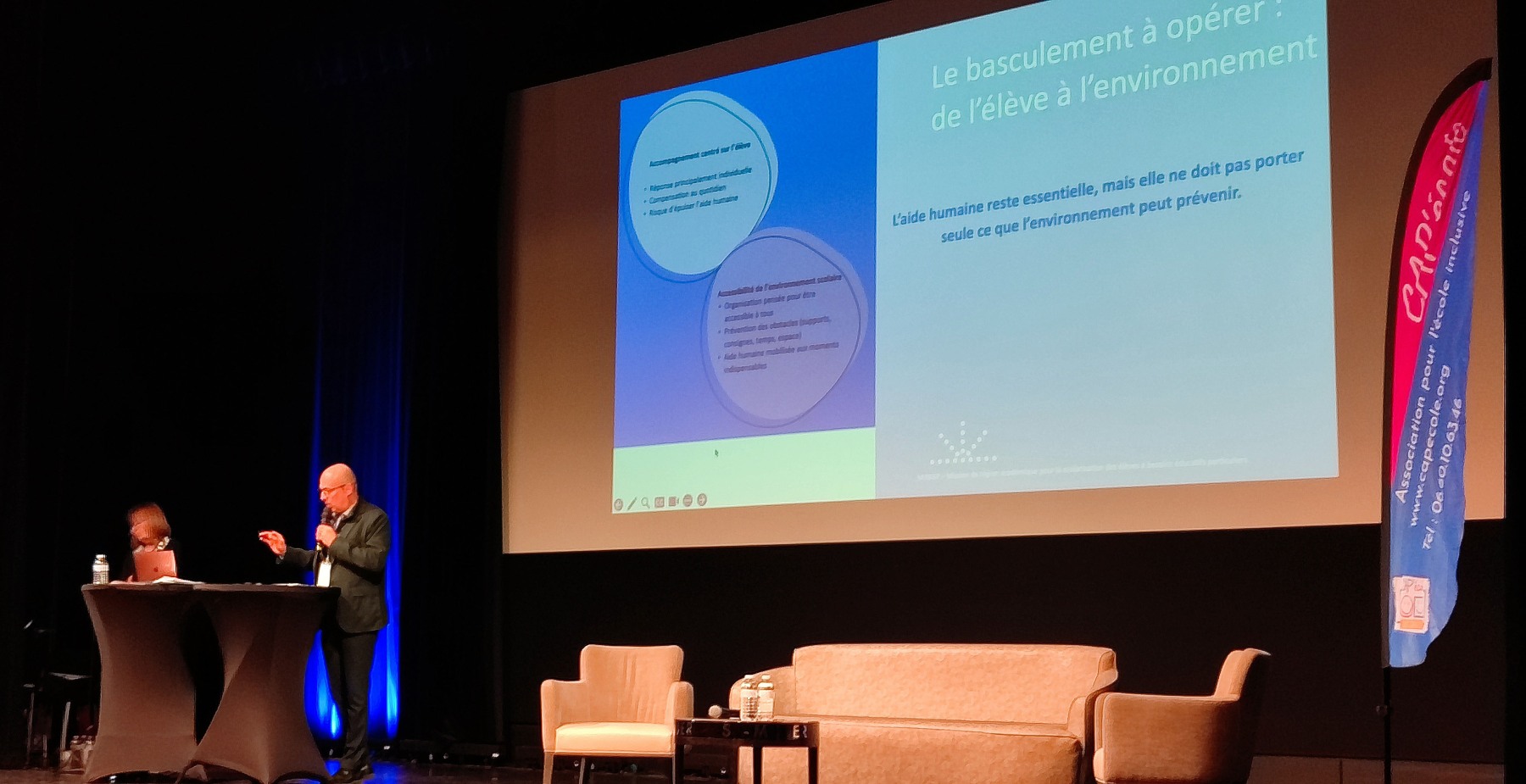Les regards croisés d’Olivier Abelsador et de Patricia Thiry (FNASEPH) sur la thématique « Présences qui comptent : repenser l’accompagnement humain à l’école », ont souligné que l’accompagnement humain, bien qu’essentiel, ne doit pas être le seul levier ni le premier mobilisé, l’environnement pouvant à lui seul prévenir de nombreuses difficultés. La proposition de la FNASEPH de transformer l’aide humaine à l’école sous la forme d’agents d’accessibilité a également été présentée.
